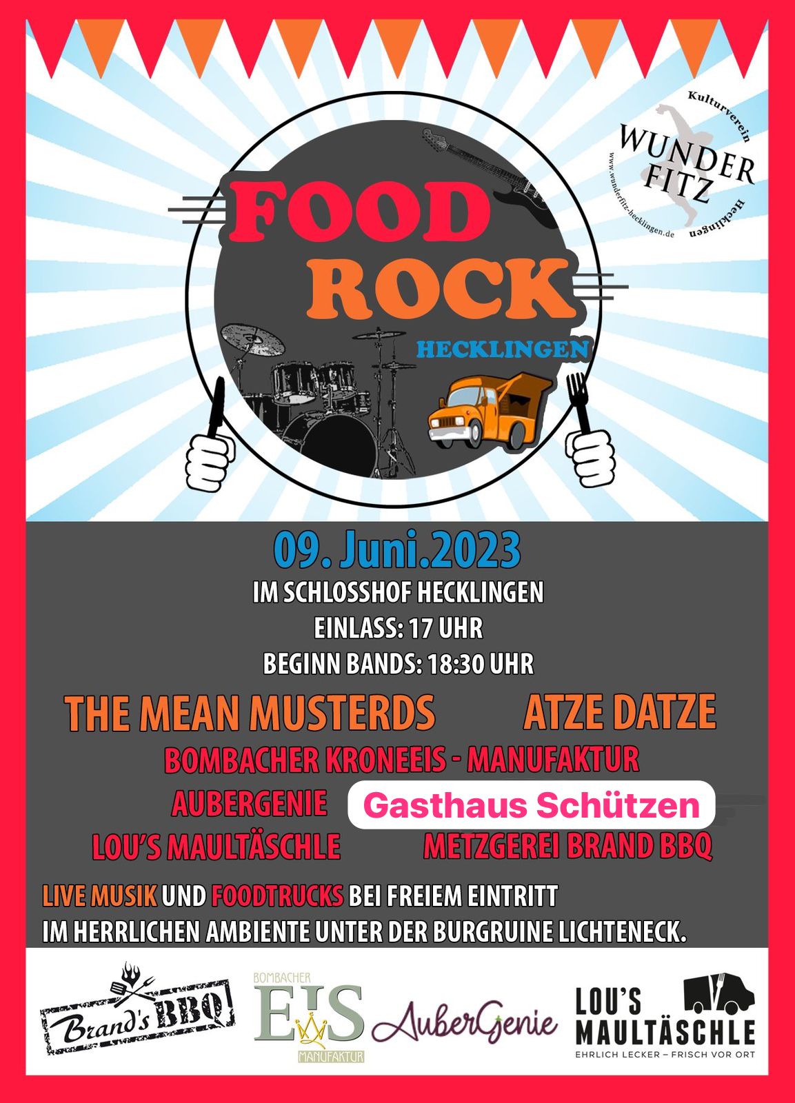 Am 09.06.2023 ab 17.00 Uhr präsentierte der Kulturverein Wunderfitz die mittlerweile vierte Open-Air-Veranstaltung dieser Art. Die Organisatoren wurden vor eine harte Probe gestellt, da ein Foodtruck am Vorabend seine Teilnahme absagte. Glücklicherweise sprang das Team des Gasthaus Schützen aus Herbolzheim kurzfristig ein. So war die Versorgung der zahlreichen Besucher gesichert.