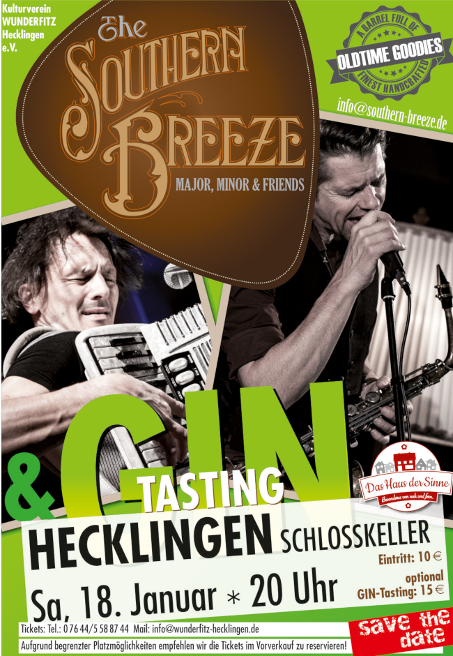 Die außergewöhnliche Combo „The SOUTHERN BREEZE“ musiziert mit akustischer Vielfalt und ehrbarem Handwerk im Schlosskeller in Hecklingen und optional für Gaumengenießer mit Gin-Tasting mit dem „Haus der Sinne“