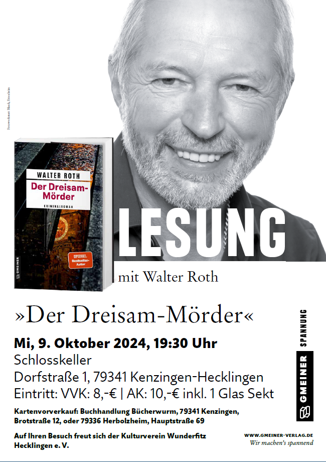 Am 09. Oktober 2024 findet im Schlosskeller in Hecklingen eine Autoren-Lesung statt. SPIEGEL-Bestseller-Autor Walter Roth liest aus seinem Kriminalroman "Der Dreisam-Mörder". Die Lesung beginnt um 19.30 Uhr (Einlass ab 18.45 Uhr). Der Ticket-Vorverkauf startet voraussichtlich ab der 38. Kalenderwoche in der Buchhandlung Bücherwurm in Kenzingen und Herbolzheim. Nach der Lesung besteht die Möglichkeit den Roman "Der Dreisam-Mörder" zu erwerben und vom Bestseller-Autor signieren zu lassen.