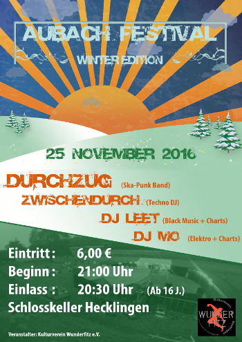 Am 25.11 veranstaltete der Kulturverein Wunderfitz im Schlosskeller ein kleines Winter Festival. Der Abend begann mit einem Beerpong Turnier. Bei ausgelassener Stimmung traten Teams wie "Alkletiko Bierbao" oder "TSG für 18,99 besoffen sein" gegen einander an. Im Finale einigten sich die Malterdinger Team "Alkletiko Bierbao" und "Bruckerboss & Co.KG" auf ein Unentschieden.
